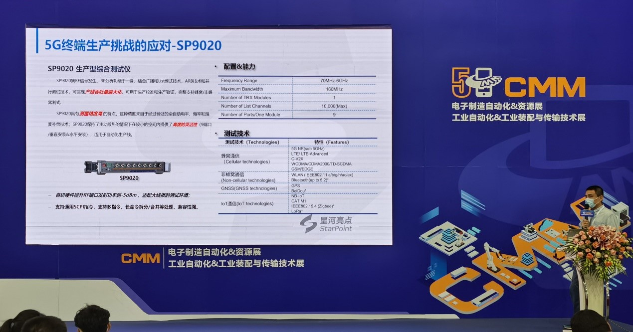 2021年5月18日,星河亮點(diǎn)產(chǎn)品總監(jiān)吳淵先生出席2021 CMM 電子制造自動化展專題論壇,代表國內(nèi)無線通信測試測量的領(lǐng)軍企業(yè),進(jìn)行“多模+定制+精準(zhǔn)高效-終端生產(chǎn)一站式解決方案”的專題匯報,并圍繞新時期新技術(shù)現(xiàn)狀下終端生產(chǎn)制造的挑戰(zhàn),與來訪嘉賓進(jìn)行充分交流和探討,同時正式發(fā)布我司新一代非信令綜合測試儀SP9020。