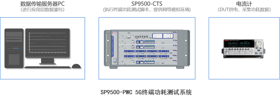 SP9500-PWC 是星河亮點(diǎn)自主研發(fā)的功耗測(cè)試解決方案,系統(tǒng)包含網(wǎng)絡(luò)模擬、功耗采集兩個(gè)主要模塊,可仿真空閑、語(yǔ)音、數(shù)據(jù)和流媒體等多種網(wǎng)絡(luò)端到端業(yè)務(wù)環(huán)境狀態(tài)。系統(tǒng)主要由三部分組成,5G系統(tǒng)模擬器(SP9500-CTS)、應(yīng)用服務(wù)器和電流計(jì),可為終端提供5G NSA/SA的網(wǎng)絡(luò)環(huán)境,支持網(wǎng)絡(luò)參數(shù)的靈活配置,控制終端在以下各種場(chǎng)景通過(guò)電流計(jì)監(jiān)測(cè)功耗: