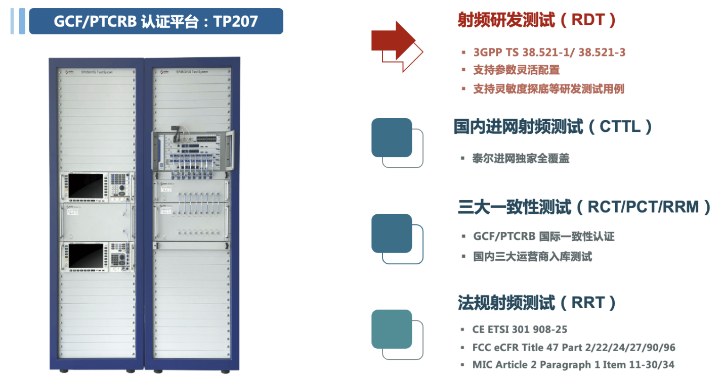 在滿足 3GPP TS 38.521-1、38.521-3規(guī)范要求的5G FR1終端研發(fā)測(cè)試需求的基礎(chǔ)上,SP9500-RDT 可通過(guò)軟件升級(jí)擴(kuò)展至GCF/PTCRB 三大一致性測(cè)試、中國(guó)大陸進(jìn)網(wǎng)許可測(cè)試(CTA)測(cè)試、歐洲CE/美國(guó)FCC/日本MIC法規(guī)測(cè)試和運(yùn)營(yíng)商一致性準(zhǔn)入測(cè)試,是滿足多種類型測(cè)試需求的一站式解決方案。